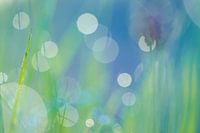 Waterdruppels op de stengeltjes van de dauw in tegenlicht op een mooie vroege ochtend. Tegenlicht zorgt voor mooie bokeh van de waterdruppels die cirkels vormen.