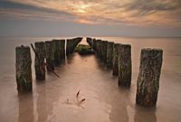 Buhne an der Küste der Ostsee im Sonnenuntergang.