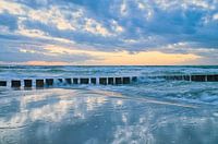 Groyne in Zingst aan de Oostzee. Kribben die in de zee reiken. Landschapsfoto. Genomen op het blauwe uur