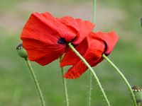 2 Klaprozen buigen door een ferme wind. Deze zag ik in de volkstuin en ging ervoor op mijn knieen om een plaatje ervan te maken.