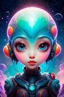 Een buitenaards meisje, met grote blauwe ogen, met een grote futuristische helm op haar hoofd, in een buitenaards landschap met roze en paarse wolken. Het surrealistische meisje heeft een lieveheersbeestje op haar schouder dat tevens haar beschermengel is. Het beeld is met behulp van ai gegenereerd.