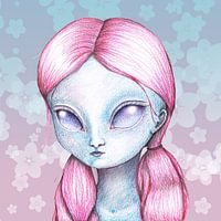 Een tekening in kleurpotlood van een buitenaards meisje. Het is een lief knap meisje om te zien met grote paarse ogen. Het portret is getekend in zachte roze en blauwe tinten. In de achtergrond zijn digitaal getekende witte bloemen.