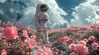Dit kunstwerk toont een dromerige scène waarin een astronaut te midden van een eindeloze bloemenzee staat.