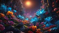 Stap binnen in een wereld van wonder en verbeelding met "Buitenaardse Schoonheid bij Zonsondergang", een betoverend digitaal kunstwerk dat een rotsachtige vallei toont tijdens een adembenemende zonsondergang. Dit unieke landschap wordt verfraaid door prachtige, kleurrijke buitenaardse bloemen die de vallei vullen met een surrealistische…
