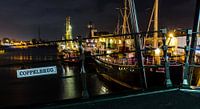 De buitenhaven van Maassluis bij nacht gezien vanaf de Coppelbrug. Met op de voorgrond de Rigel (zeekadetten) uit 1948, in het midden de Steenbank (wordt gerestaureerd) uit 1960 en aan het eind de Elbe (gerestaureerd) uit 1959.