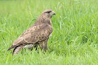 Een portret van een Europese Buizerd rustend in een weide. Dit zijn heel algemeen voorkomende roofvogels, maar dat maakt ze niet minder bijzonder. Schitterende en krachtige dieren.