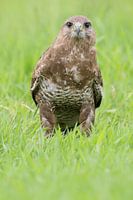 Een portret van een Europese Buizerd rustend in een weide. Dit zijn heel algemeen voorkomende roofvogels, maar dat maakt ze niet minder bijzonder. Schitterende en krachtige dieren.