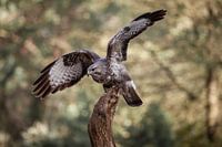 Een mooie roofvogel de Buizerd die land op een paal. Met zijn vleugels nog mooi gespreid en met een prooi in zijn klauwen.