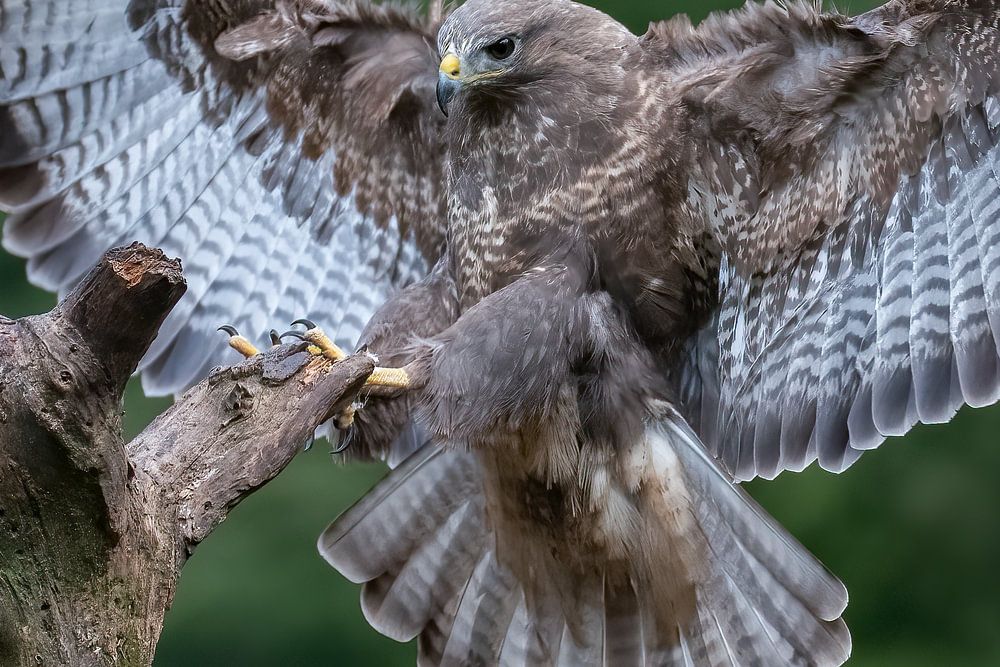 Buizerd zet met gespreide vleugels en gespreide staart de landing in.