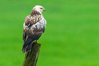 Buizerd (Buteo buteo) zit op een paal en kijkt uit over een weiland op zoek naar een prooi. De buizerd heeft een winterkleed met meer witte veren dan het normale bruine verenkleed in de zomer.
