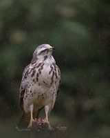 Deze buizerd zat zijn prooi op te eten in de regen, toen hij stopte omdat hij een andere buizerd hoorde....hij wilde vast zijn prooi niet afgeven :-)