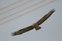 Zittend in een hoogzit kwam deze mooie buizerd over zweven. Met op de achtergrond vier hoogspanningskabels.