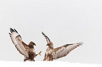 Vechtende Buizerds in de sneeuw in Hongarije. In dreighouding staand met opgeheven vleugels.