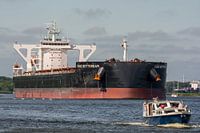 Bulkcarrier CSSC onderweg naar de haven van Amsterdam om haar vracht te lossen. Begeleid door een pleziervaartuig. En het volgende schip alweer in zicht.