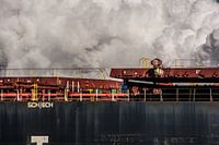 Stoomwolken van een koeltoren. de dekluiken van een zeeschip. Het ene luik dicht het andere luik is open om de lading te lossen. Alle kleuren en leidingen aan dek geven veel details. De roestsporen op de de romp in de zwarte verf de zoutsporen van uit het gangboord.
