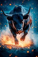 Deze indrukwekkende toros straalt een sterke aanwezigheid en dynamiek uit en loopt krachtig door een zee van vonken en licht. De levendige energie en het contrast tussen de duisternis en de gloed van de vlammen maken het een fascinerende blikvanger. Ideaal voor een woonkamer, waar hij gesprekken kan stimuleren en de sfeer kan verlevendigen.