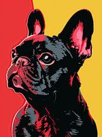 Bulldog Popart | Franse Bulldog Popart - De afbeelding laat een portret zien van een Franse bulldog, uitgevoerd in een gedurfde popart-stijl die de karakteristieke features van het dier accentueert. Levendige contrasten tussen het zwarte, roze-rode en gele kleurenpalet kapen de aandacht, terwijl de vereenvoudigde vormen en omtrek lijnen een dynamische, bijna cartooneske flair geven.