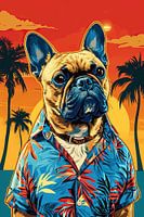 Bulldog in the Summer - Dit levendige portret van een stoere bulldog, gekleed in een tropisch shirt, vat de zomerse vibe perfect samen. Met een ondergaande zon en palmbomen op de achtergrond straalt deze illustratie een vrolijk en ontspannen gevoel uit. De krachtige oranje en blauwe kleurencombinatie maakt het geheel extra…