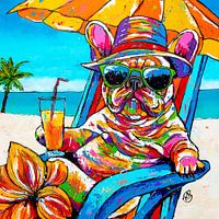 In een levendig en kleurrijk schilderij staat een bulldog centraal in een tafereel dat puur strandgeluk uitstraalt. De speelse bulldog nestelt zich comfortabel in een strandstoel, zijn poten rusten ontspannen op de armleuningen. Met een stijlvolle zonnebril en een kleurrijke strandhoed is hij het toonbeeld van cool en ontspanning.