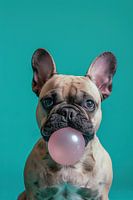 Bulldog - Dit levendige portret toont een charmante Franse Bulldog met een speelse roze kauwgom bel die feilloos overeenkomt met zijn onweerstaanbare ogen. De heldere turquoise achtergrond laat de subtiele bruintinten van zijn vacht en de glanzende textuur van de kauwgom echt poppen, wat een frisse en moderne uitstraling geeft.