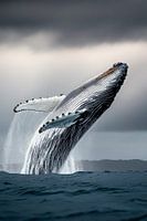 In een krachtig moment rijst de majestueuze walvis op uit de golven terwijl waterfonteinen in alle richtingen spatten. Zijn glanzende, gestreepte lichaamsontwerp weerspiegelt de ongetemde schoonheid van de oceaan en de dramatische wolkenachtergrond verleent de scène een epische stemming. Een adembenemend samenspel van natuur en kracht ontvouwt zich.