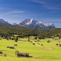 Hier, tussen Mittenwald en Krün in Opper-Beieren, Beieren, Europa, kun je de wereld met andere ogen bekijken, kun je de adem van de natuur voelen en de magie van het moment vastleggen. En in dit uitzicht op de heuvelachtige weiden en de majestueuze Zugspitze wordt de ware grootsheid en pracht van de schepping onthuld - een geschenk dat de ziel raakt en het hart vult met dankbaarheid voor het wonder van het leven.