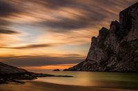 Sunset on Bunes beach with rocky mountains in background, Lofoten