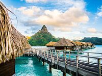 Bungalows van resort boven blauwe lagune op Bora Bora