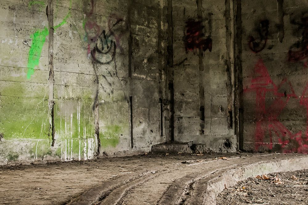 Een van de bunkers in Willemstad. De halve cirkel die je weg ziet lopen, was het fundament voor het kanon dat over deze 'rails' van richting veranderd kon worden.
