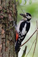 Greater / Great Spotted Woodpecker / Buntspecht ( Dendrocopos major ) perched on a tree trunk, searching for food to feed ist chicks, beak full of insects, wildlife, Europe.