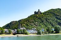 De burcht Maus kijkt vanaf een heuveltop op de oostoever uit over de Rijn en kleine plaats Welmich.