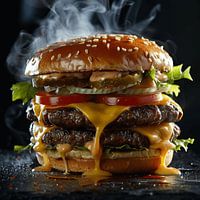 Ervaar de ultieme verwennerij met deze prachtige afbeelding van een sappige dubbele cheeseburger die prikkelt met gesmolten kaas en verse ingrediënten. De opstijgende stoom en smakelijke presentatie maken deze poster een must-have voor elke keuken of eetkamer. Ideaal voor hamburgerliefhebbers en foodies die een vleugje culinaire kunst willen toevoegen aan hun ruimte.