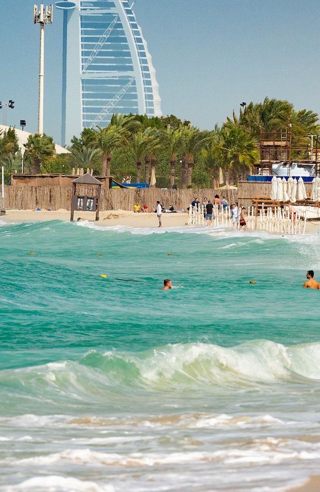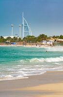 Dubai's JBR Beach met op de achtergrond Burj al Arab, het enige 7-sterrenhotel in de wereld.