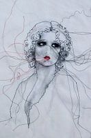 Een figuratief werk van zwart & rood draad, houtskool & krijt op doek. Een portret van een vrouw in de sensuele sfeer van (burlesque)noir. De dromerige en wegkijkende blik laat je afvragen wat haar gedachten zijn.