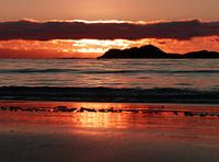 Middernachtzon op het strand van Ramberg op het eiland Flakstad op de Lofoten een eilandengroep in Noorwegen. De zon gaat niet onder de horizon