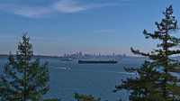 Uitzicht over Burrard Inlet met voor anker liggende vrachtschepen en de skyline van Vancouver, British Columbia, Canada op de achtergrond met de contouren van Mount Rainier in de nevel op een zonnige dag in de herfst gezien vanuit Lighthouse Park in West Vancouver.
