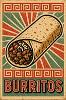 Haal de sfeer van Mexicaans straateten in huis met deze levendige Burritos poster. De poster is ontworpen in een gedurfde retro pop-artstijl en toont de perfect opgerolde tortilla boordevol rijst, bonen en pittige vullingen, omringd door kleurrijke geometrische Azteekse patronen. De compositie en het palet met rustieke roodtinten, saliegroen en zongebakken beige weerspiegelen de vrolijke chaos van een Mexicaanse markt. Met een zacht verouderde papiertextuur en zeefdrukachtige korrel voelt het kunstwerk zowel nostalgisch als eigentijds aan. Perfect voor fijnproevers, restauranteigenaren of iedereen die houdt van Latijns-Amerikaanse designesthetiek, voegt dit stuk een dynamische scheut energie toe aan keukens en eetruimtes. Het is meer dan een muurdecoratie, het is een eerbetoon aan de culturele kracht van Mexicaans eten en de warmte die het brengt naar elke bijeenkomst.