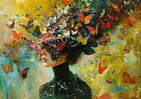 Burst of Colors Silence - Dit surrealistische schilderij toont een vrouw omgeven door een kleurrijke zwerm vlinders die als een hoed boven haar hoofd zweven.