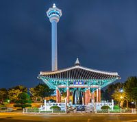 Yongdusan Park met de 120 meter hoge Busan toren tijdens de nacht. Busan stad, Zuid-Korea