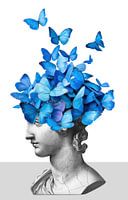 Marmeren torso van een Griekse God, overwoekerd met blauwe vlinders.