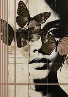 Zwartwit mixed media portret van een mooie vrouw omgeven door bruine vlinders in aardetinten. Over haar gezicht lopen dunne lijnen in een raster. Ook lopen er bruinkleurige lijnen over de afbeelding. Ook zijn er vage grijsbruine stroken te zien. Haar gezicht vervaagd aan een kant in witbeige. Indringende en mysterieuze oogopslag. Sober, landelijk, naturel en zwartwit. sepia, beige, bruin.