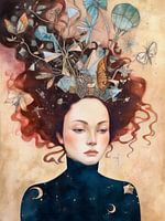 Een betoverende jonge vrouw wordt het middelpunt van een levendige vlindertuin die rechtstreeks uit haar donkere haar lijkt te komen. Haar krullende, roodbruine lokken worden omgetoverd tot een sprookjeslandschap vol fladderende vlinders, glinsterende kristallen en delicate bloemblaadjes. De compositie ziet eruit als een natuurlijke…
