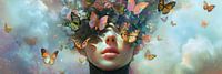 Butterfly Dreams - Dit surrealistische vrouwenportret schilderij toont een etherische vrouw omringd door een vlinderzwerm, met een dromerige, mystieke achtergrond van zachte pastelkleuren.