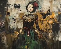 Butterfly Elegance - Dit vrouwen schilderij toont een elegante dame in een gedetailleerde zwarte jurk versierd met gouden en groene accenten, omgeven door abstracte vlinders en een levendig, texturisch achtergrond in aardetinten.