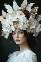 Een betoverend portret waarin pure romantiek en natuurlijke gratie samensmelten. Een weelderige kroon van witte bloemen wordt versierd door zwevende vlinders in harmonieuze tinten van wit en bruin. De zachte belichting en serene sfeer creëren een tijdloos beeld dat doet denken aan een sprookjesachtige droom, vastgelegd in een perfect moment van verstilde schoonheid.