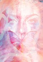 Je ziet een vrouw met een vlinder op haar lippen. Het is een interessant beeld doordat het opgebouwd is uit meerdere afbeeldingen. Het geeft een schilderij gevoel maar het in in elkaar gezet met Photoshop
