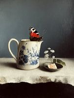 Een verstild tafereel waarin tijd lijkt stil te staan: een vlinder heeft zojuist plaatsgenomen op de rand van een oud crèmekleurig kannetje met klassiek blauw bloemenmotief. Naast hem ligt een klein schaaltje met een oosters zeepje (of is het een snoepje? dat blijft een mysterie), en een paar tere witte veldbloemen maken de compositie…