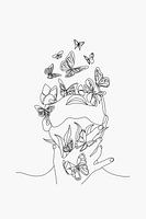 Digital art tekening van een deel van een vrouwengezicht gecombineerd met vlinders. Zwart en roomwit. Titel: "Butterfly"