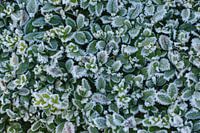 De bladeren van de buxus zijn bedekt met lichte vorst. Een blikvanger, hoe de kleine tere blaadjes een witte krans met ijs dragen.