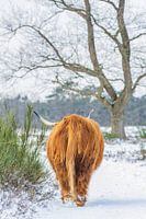 Schotse Hooglander loopt weg in de sneeuw op de Hilversumse heide. Deze grote runderen zijn hier gewend aan fietsers en wandelaars en lopen van je weg in plaats van naar je toe.